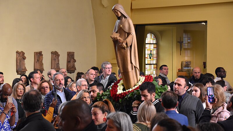 Une église comble, et pratiquement autant d’enfants que d’adultes, a accueilli la procession des reliques de sainte Thérèse en chantant à pleine voix : aux deux premiers rangs, les enfants de la catéchèse, sur l’estrade les chanteurs luxembourgeois, ukrainiens et maronites, accompagnés par l’orgue de Paul Hilbert ou par le piano. La foi de la communauté réunie est palpable et on ne peut s’empêcher de penser au « todos, todos, todos » cher au cœur du pape François. Monseigneur Wagener, notre évêque auxiliaire, en est touché : « Quelle joie c’est pour moi d’être accueilli aujourd’hui par vous en communion avec sainte Thérèse de Lisieux, car nous célébrons cette messe en l’honneur de la patronne de cette église. Thérèse nous donne la mission de faire aimer Jésus. Ouvrons nos cœurs à cet amour. »