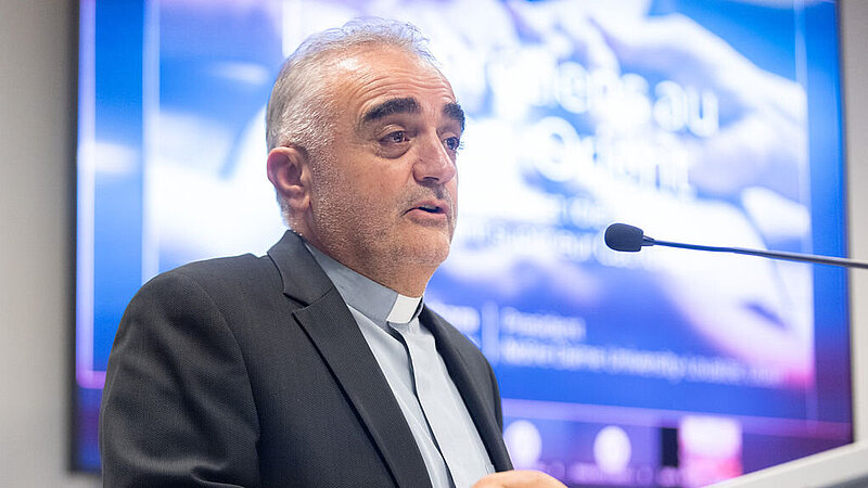 Avant de laisser la parole au conférencier, les violoncelles de Judith Lecuit et Maria Kulowska, de l’Orchestre de Chambre du Luxembourg, ont installé dans la salle le juste climat de concentration. « Nous partageons une seule mission, a commencé le Dr. Khoury : comment faire un monde meilleur ? » Puis l’universitaire formule deux hypothèses : l’enseignement supérieur catholique est un instrument stratégique pour la paix et ces institutions catholiques contribuent à ouvrir des horizons d’espérance. Mais l’enjeu crucial un peu partout au Moyen Orient est la survie des communautés chrétiennes. « Notre rôle dans l’éducation est aussi d’offrir des raisons concrètes aux jeunes de rester dans cette région ». Par son accueil d’un fort pourcentage d’étudiants non chrétiens (40% en moyenne au Liban), l’enseignement supérieur catholique agit comme un ciment entre les communautés. « Les campus sont des ateliers de coexistence » remarque le père Khoury qui termine son intervention par une citation : « Le pape Jean-Paul II a dit que le Liban est plus qu’un pays, il est un message. Il est plus que cela encore. Il est un laboratoire pour exporter la coexistence à l’extérieur et être le sel de la terre. »