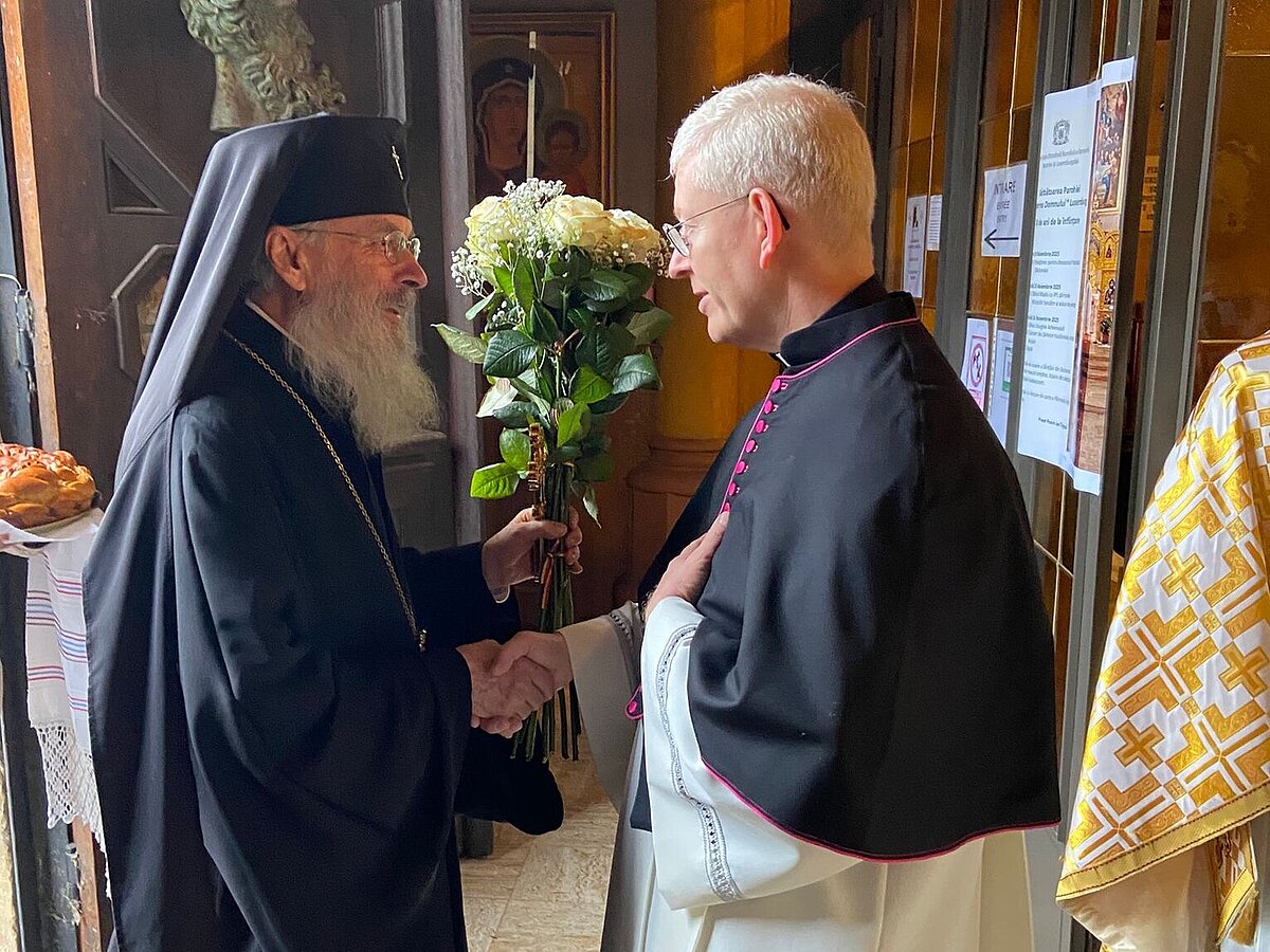 Après avoir remercié le premier curé de la paroisse, le père Constantin Duțuc, et le nouveau curé depuis 2024, le père Ion Tîrgoală, pour leur bon travail dans cette paroisse vivante et en croissance, le chanoine Patrick Muller a remis au Métropolite Serafim une bougie avec le logo de l’année Sainte « Pèlerins d’Espérance ». Tout en leur présentant les meilleurs vœux du cardinal Hollerich, il a invité les fidèles à « avancer ensemble avec Jésus-Christ présent parmi les chrétiens des différentes confessions chrétiennes, comme le pape Léon nous invite à le faire, dans la continuité de l’Année sainte initiée par le pape François. »