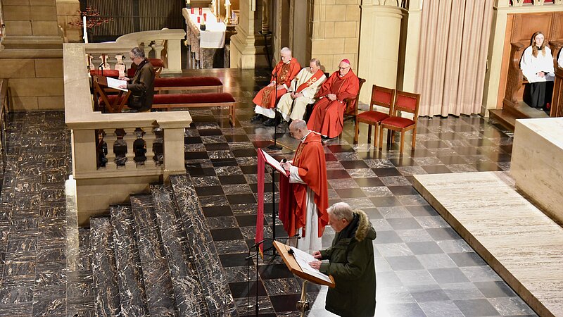 La liturgie de la parole est dominée par la lecture de la Passion du Seigneur selon saint Jean. Certes, comme le remarque Monseigneur Wagener dans son homélie, la liturgie du Vendredi saint est longue. Il arrive que certains fidèles le relèvent. Mais il faut la situer dans le contexte de la Passion : l'agonie du Christ a été longue elle aussi, et la liturgie accompagne la Passion du Seigneur. "Nous vivons des temps troublés, avec des guerres, des conflits et de très nombreuses souffrances, hélas - c'est le mystère de la Croix". Mais, le troisième jour, le Christ resssuscitera, Lui qui est la Vérité.