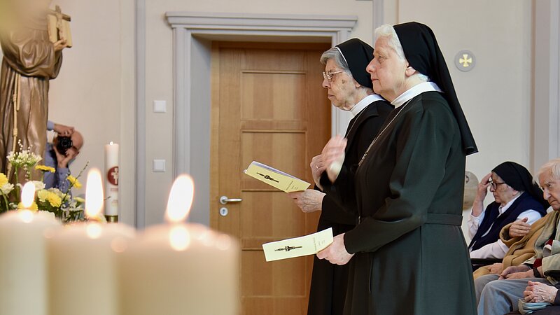 Après l’homélie, sœur Dorothe-Maria Lause, supérieure générale de la Congrégation, a dit quelques mots pour introduire le renouvellement de la profession religieuse des sœurs jubilaires. « Il y a cinquante ans, vous avez décidé de vivre selon les préceptes du saint Évangile. C’est avec une profonde gratitude pour votre fidélité que nous célébrons aujourd’hui votre jubilé. Vous réaffirmez votre engagement envers notre vie franciscaine et renforcez votre décision de suivre le Christ par le renouvellement de vos vœux. À la lumière de l’Évangile que nous venons d’entendre – « Allez dans le monde entier et prêchez l’Évangile » –, vous prononcez à nouveau votre « oui » et votre volonté de poursuivre le chemin que vous avez commencé il y a cinq décennies. Célébrons maintenant cet acte solennel de foi et de consécration dans une communion fraternelle et prenons à cœur ce que François d’Assise nous dit aujourd’hui, à nous tous, à la fin de sa vie : J’ai fait ce qui m’incombait ; quant à ce qui vous incombe, que le Christ vous l’enseigne. »